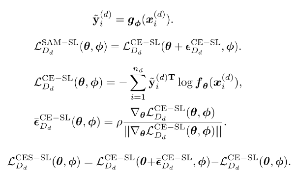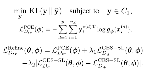 landscape refiner $g_{\phi}$는 soft label (SL) $y^{(d)}_i$를 출력으로 생성합니다. Feedback phase에서는 one-hot label을 soft label로 대체하여 모델을 학습시킵니다. (위 수식은 모두 y를 y로 바꾼 것이라 보면 됩니다.)
