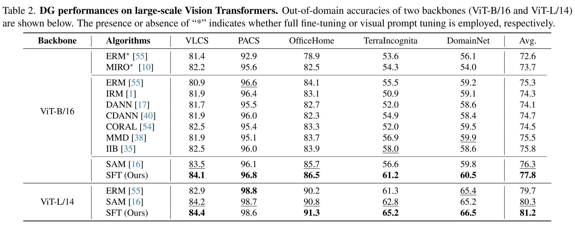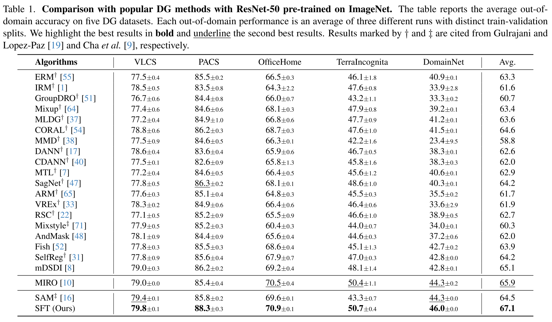 ResNet50 에 대해서 SAM이 ERM보다 좋으며 SFT가 SOTA 성능을 보여주는 것을 확인할 수 있습니다.