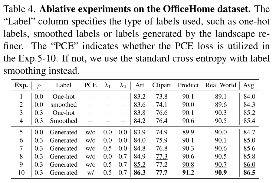 Refinement phase는 feedback signal을 바탕으로 landscape refiner $g_{\phi}$를 학습하는 과정입니다. 이 과정에서 label의 correctness을 유지하는 것과 soft label이 domain generalization에 도움을 준다는 사실을 중요하게 생각하였습니다. 이에 따라 일반적인 cross-entropy loss를 사용할 수도 있었지만, 그렇게 되면 one-hot target에 overfitting하게 되고 결국 generalization 능력에 제한이 생기는 문제가 발생할 수 있습니다. 대신 저자들은 각 클래스에서의 soft label의 분포 '거리'를 최소화하는 것에 초점을 맞췄습니다. 이는 KL divergence를 통해 달성할 수 있는데 좀 더 효과적인 학습을 위해 Lagrange function과 KKT condition을 사용해 최적화된 soft label 분포를 학습시켰습니다. 본 논문에서는 이를 Projected Cross Entropy (PCE)라고 소개하며 자세한 내용은 논문의 supplementary를 참고하시기 바랍니다.