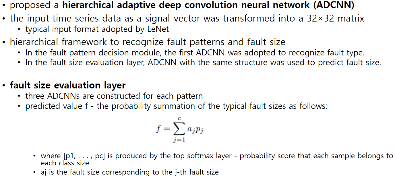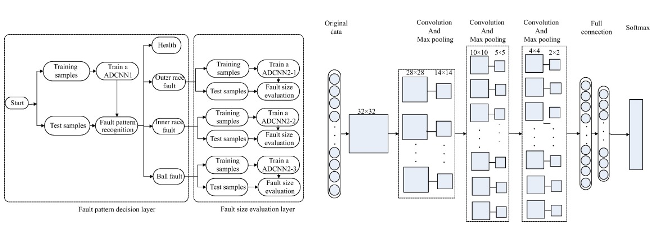 이 논문에서는 계층적인 fault diagnosis 모델인 hierarchical adaptive deep convolution neural network(ADCNN)을 만들었습니다. 먼저 비정상의 종류를 판별하는 ADCNN을 하나 두고, 3개의 비정상 상태에 대하여 각각의 ADCNN이 비정상의 정도를 판단하게 됩니다.