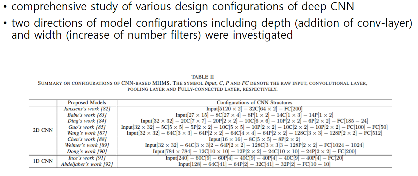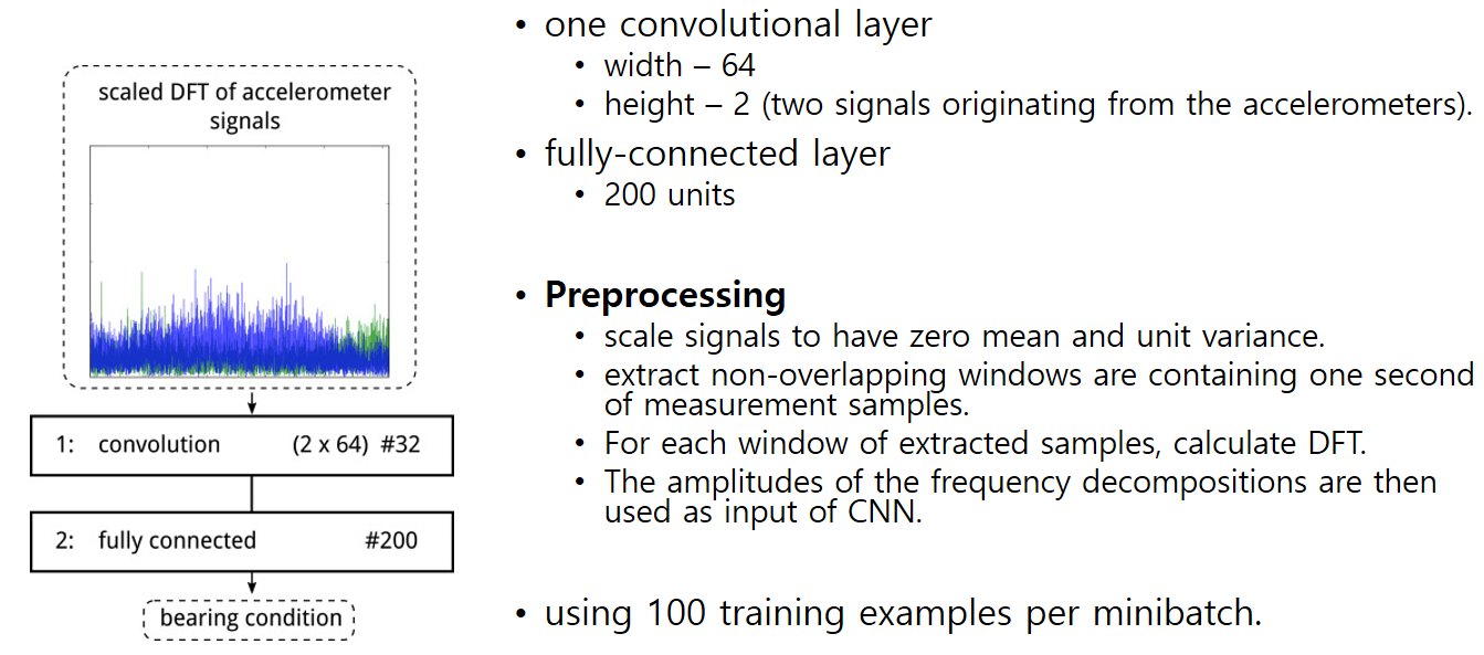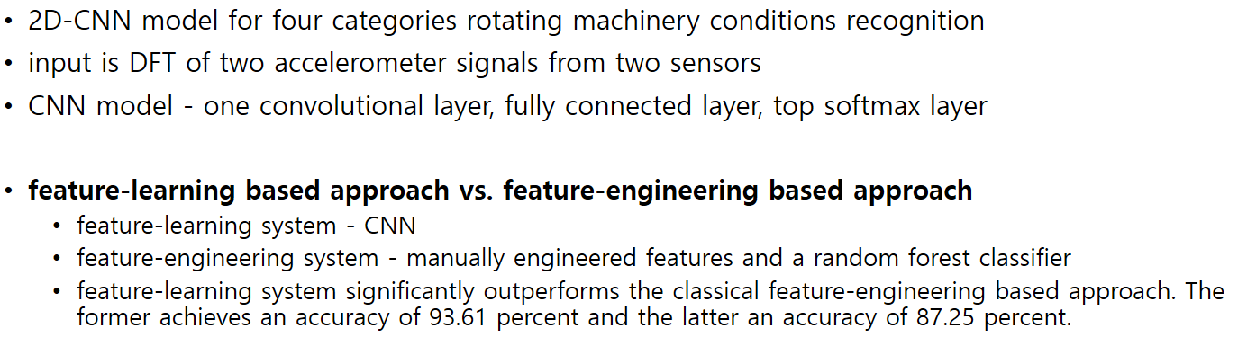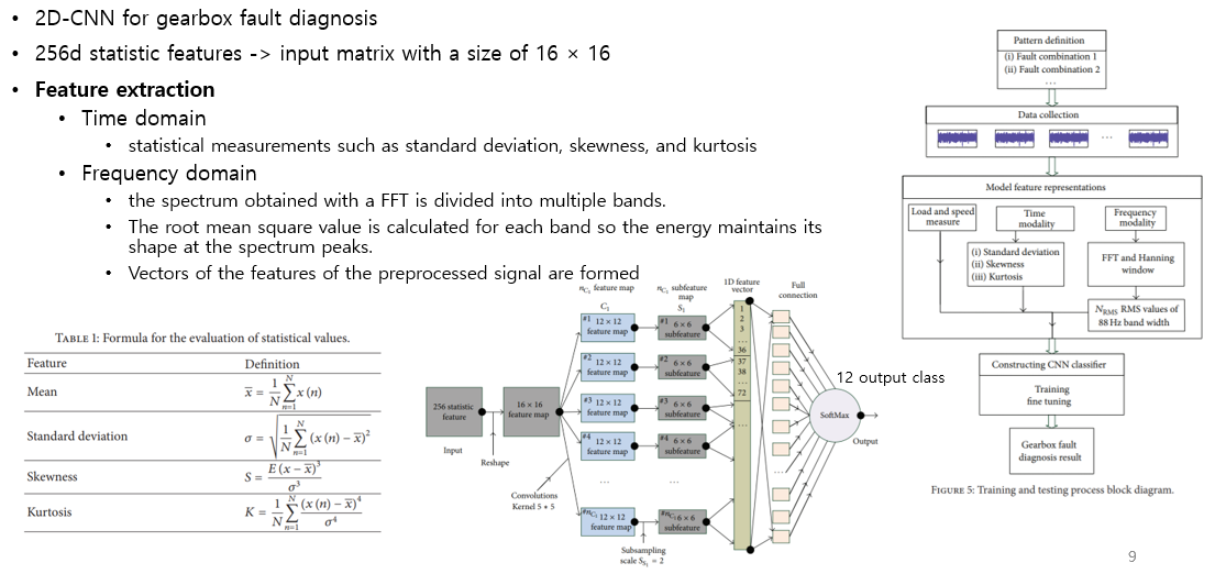 이 논문에서는 gearbox의 이상을 확인하기 위해 2D-CNN을 사용했습니다. 256차원의 통계 피쳐를 추출한 후 이를 16x16 차원의 input matrix로 변환합니다. 시간 도메인에서는 standard deviation, skewness, kurtosis와 같은 통계 피쳐를 추출하였고, frequency domain에서는 Fast Fourier Transform을 수행한 후 이를 몇 개의 band로 나눠서 각 band에 대해 RMS값을 피쳐로 사용하였습니다.