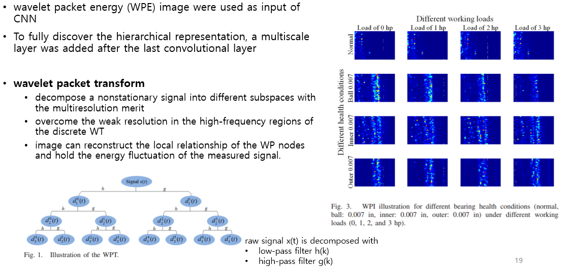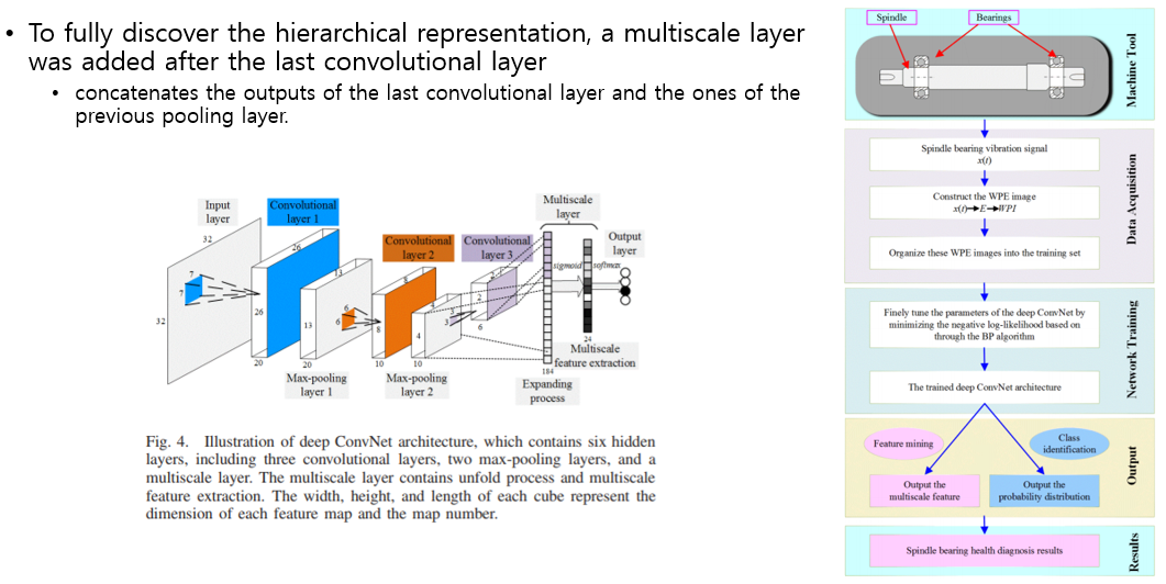 이 논문에서는 CNN의 input으로 WPE(Wavelet Packet Energy) image를 사용하였습니다. WPE의 계층적인 특성을 잘 반영하기 위하여 convolution layer의 마지막에 multiscale layer를 추가하였습니다.