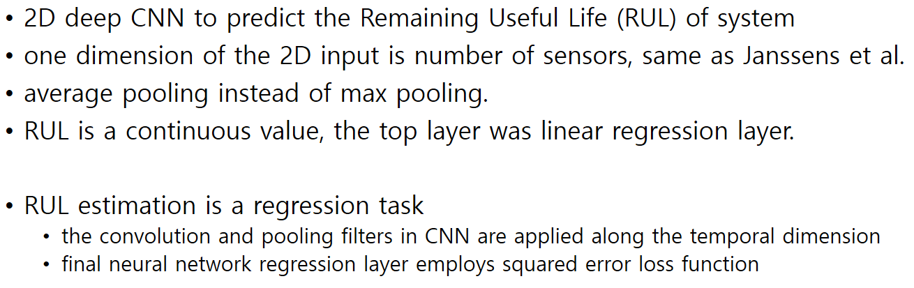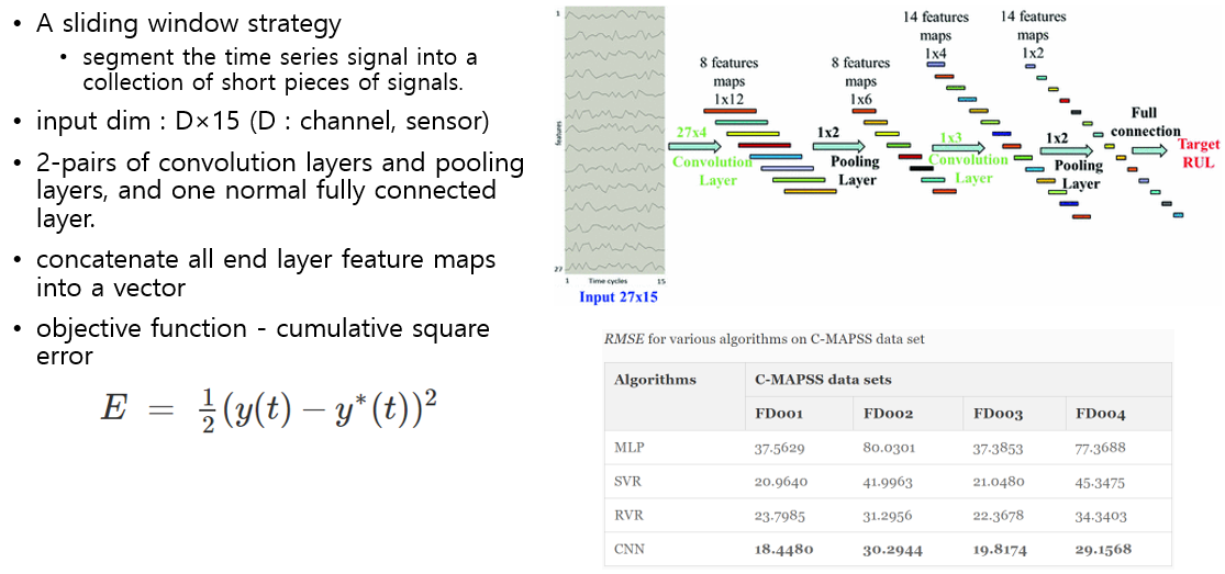 기계의 상태를 분류하는 앞선 논문의 모델과는 다르게, 이 논문에서는 잔여 수명(Remaining Useful Life)을 예측하는 모델을 만들었습니다. 따라서 분류 모델 대신 회귀 모델을 쓰고, 마지막 layer로는 linear regression layer를 사용합니다.