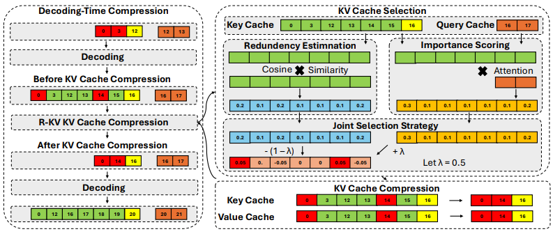 추론 모델에서 장문의 출력을 생성함에 따라 반복되는 캐싱 문제를 해결하기 위한 방법을 제안한다. Importance score는 일반적인 어텐션 스코어를 사용하며 Redundancy estimation에서는 코사인 유사도를 활용한다. 두 평가지표를 활용하여 중요도와 반복성을 \lambda로 제어하여 적절한 전략을 탐색한다. 계산된 점수를 통해 Top-k의 캐시들만 선택한다.