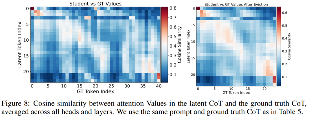 Figure 7은 latent CoT(implicit CoT)와 정답 CoT 간의 코사인 유사도를 측정한 결과이다. 왼쪽 그림은 R-KV로 KV cache를 압축하지 않은 상태에서 KV distillation loss로 학습한 결과인데, 정답 CoT와의 유사도가 거의 없는 반면, 압축된 KV cache로 학습한 결과 대각 행렬의 값이 높은 것을 통해 정답 CoT와 latent CoT의 유사도가 높은 것을 확인할 수 있다.