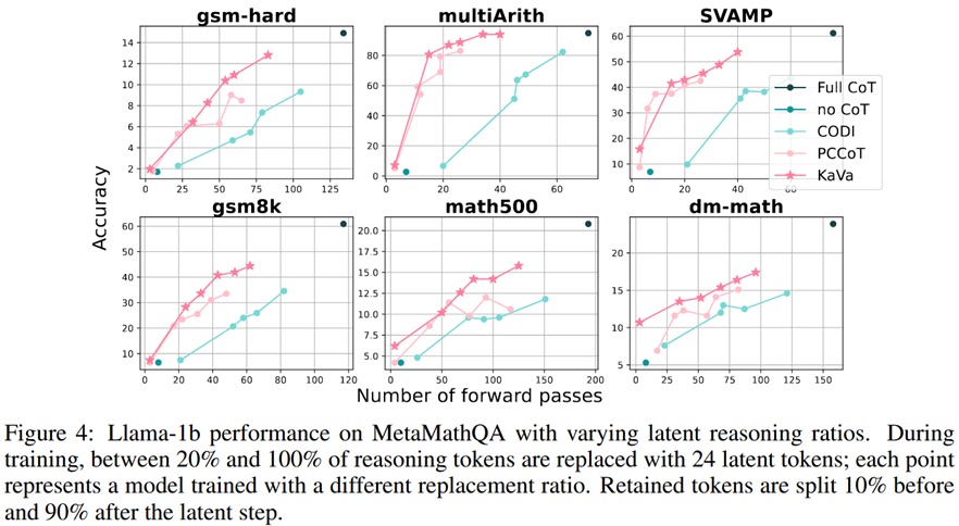Figure 4는 explicit CoT 토큰을 일정 비율만큼 latent token으로 변경하여(20%->40%->60%->80%) 정확도와 효율성 간의 상관관계를 측정한 결과이다. x축은 CoT를 생성하는 데 필요한 forward pass의 수를 의미한다. 그림을 통해 알 수 있듯이, KAVA가 다른 방법들보다 더 좋은 Pareto frontier를 보여주고 있다.