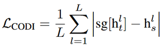 CODI loss는 student/teacher 모델에서 정답 직전 토큰의 hidden state를 정렬시키기 위한 손실 함수이다. Teacher 모델에서 Student 모델로 지식을 증류시킬 것이므로 sg(stop gradient)를 통해 teacher에 gradient가 흐르지 않도록 한다.