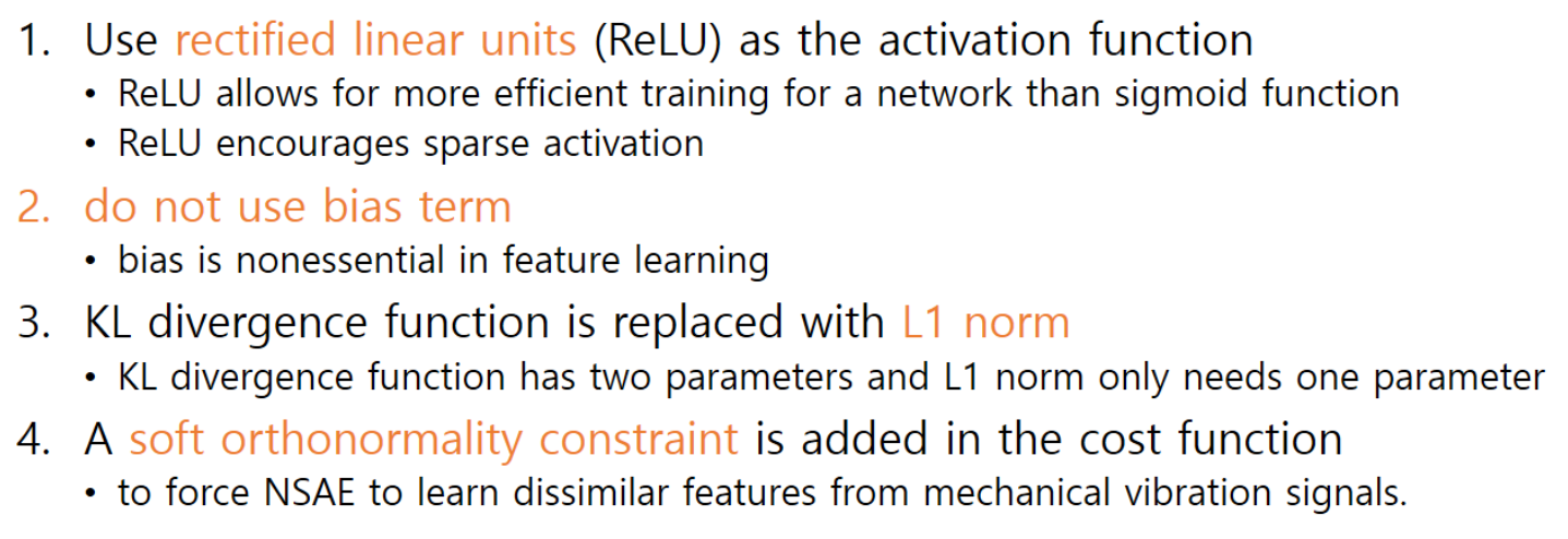 이 논문에서 제안하는 NSAE는 traditional sparse autoencoder와 달리 다음과 같은 네가지 특징을 가지고 있습니다. (1) Activation 함수로 Sigmoid 대신 ReLU를 사용하고, (2) bias term을 사용하지 않고, (3) KL divergence term을 L1 norm으로 대체하고, 마지막으로 (4) 목적 함수에 soft orthonormality constraint를 적용합니다. 저는 4번이 이 논문의 핵심 아이디어라고 생각했습니다.