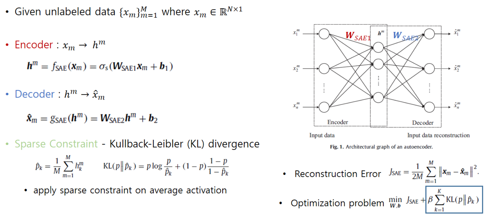 NSAE를 보기 전에 먼저 전형적인 sparse autoencoder를 보도록 하겠습니다. unlabeled data $\{x_m\}^M_{m=1}$이 주어졌을 때, encoder, decoder의 구조는 다음과 같습니다. hidden layer $h_m$을 sparse하게 만들기 위해 KL divergence term이 목적 함수에 추가됩니다. 이는 activation 값의 평균에 페널티를 줘서 hidden layer에 0에 가까운 값이 많아지도록 합니다.