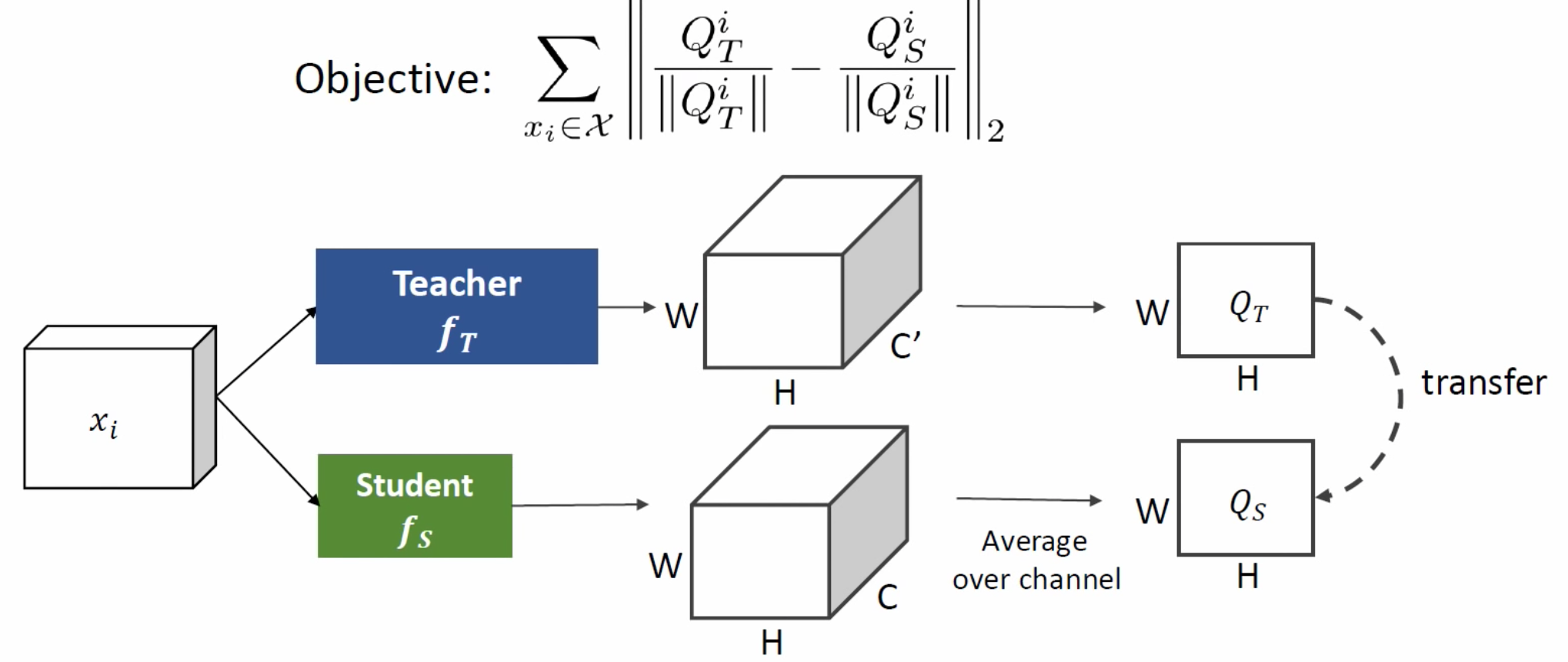 또 하나의 방법으로는 Zagoruyko et al., ICLR, 2017처럼 Attention을 Transfer하는 방법이 있습니다. 아래의 그림처럼 Convolution Output Tensor가 존재할 때, 이를 Channel wise하게 평균을 취하여 Special attention Matrix를 생성하고 이들 간의 Transfer를 하는 방식입니다.