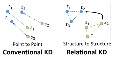 이는 그림.5에서 의미하 듯, Teacher model과 Student model 간의 output vector를 individual하게 mapping하는 것이 아니라 이들의 관계 즉, distance와 angle 두 가지 측면을 고려한 potentiality를 전이하도록 하여 보다 student model이 output의 상관관계는 이해하지만 mapping 결과는 주도적으로 만들도록 하였습니다. 본 논문의 전이 방식에서 제안하는 2가지 loss function (distance, angle)은 해당 논문을 확인해주세요.