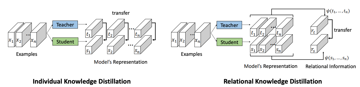 본 논문은 이와 같은 유형의 Distillation기법 즉, Teacher model의 Output을 Student model의 Output에 전이하는 방식을 일반화 하여 Individual Knowledge Distillation (IKD)라 정의하였으며, 이러한 방식과는 다르게 아래의 그림.4처럼 Relational Knowledge Distillation (RKD)을 통한 Knowledge Distillation을 제안하였습니다.