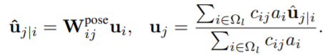 이후 레이어의 capsule을 구하기 위해 $a_j$를 가중치로 사용합니다.