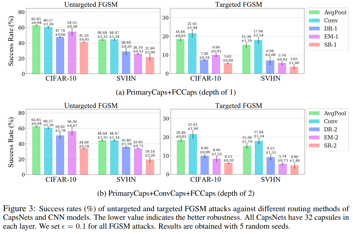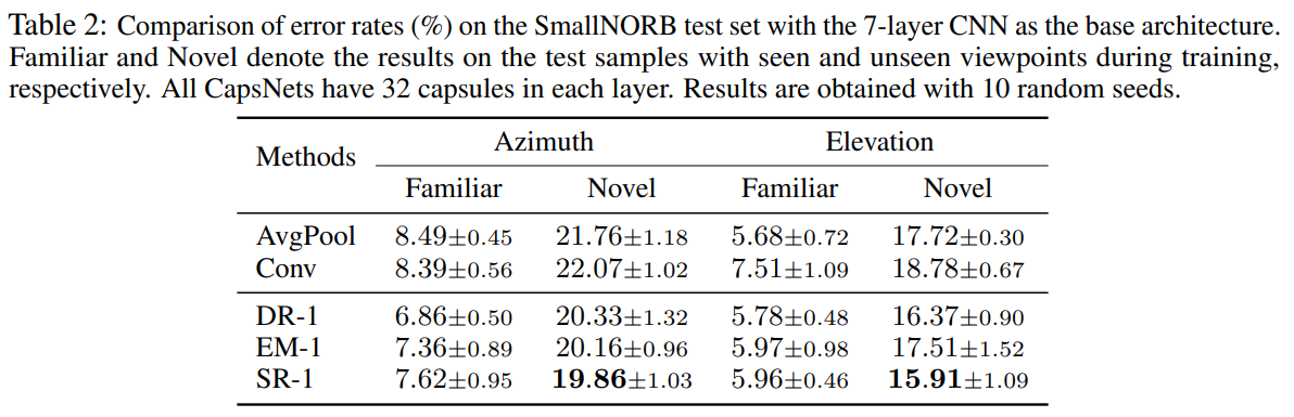 실험 결과에 따르면 SR-CapsNet 모델은 기존의 Routing-by-agreement 방식 두 가지 (Dynamic Routing과 EM Routing) 보다 더 좋은 이미지 분류 성능을 보였다고 합니다. 뿐만 아니라 Adversarial Example과 Affine Transformation에도 잘 대응했는데요, Routing-by-agreement를 사용하지 않고도 일반화가 가능하다는 것을 실험으로 보여줬습니다. 아래에 실험 결과가 제시되어 있습니다.