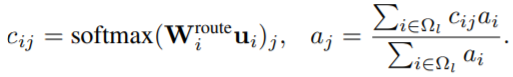 더 자세히 들어가 보겠습니다. 먼저 현재 레이어의 capsule vector $\hat{\mathbf{u}}$ 에 가중치 $\mathbf{W}^{route}$를 곱하고 softmax를 취해서 routing coefficient $c_{ij}$를 계산합니다. 그 다음 $c_{ij}$를 capsule의 activation scalar $a_i$와 곱하여 가중합을 한 것을 그 다음 레이어의 j번째 capsule의 activation scalar $a_j$로 사용합니다.