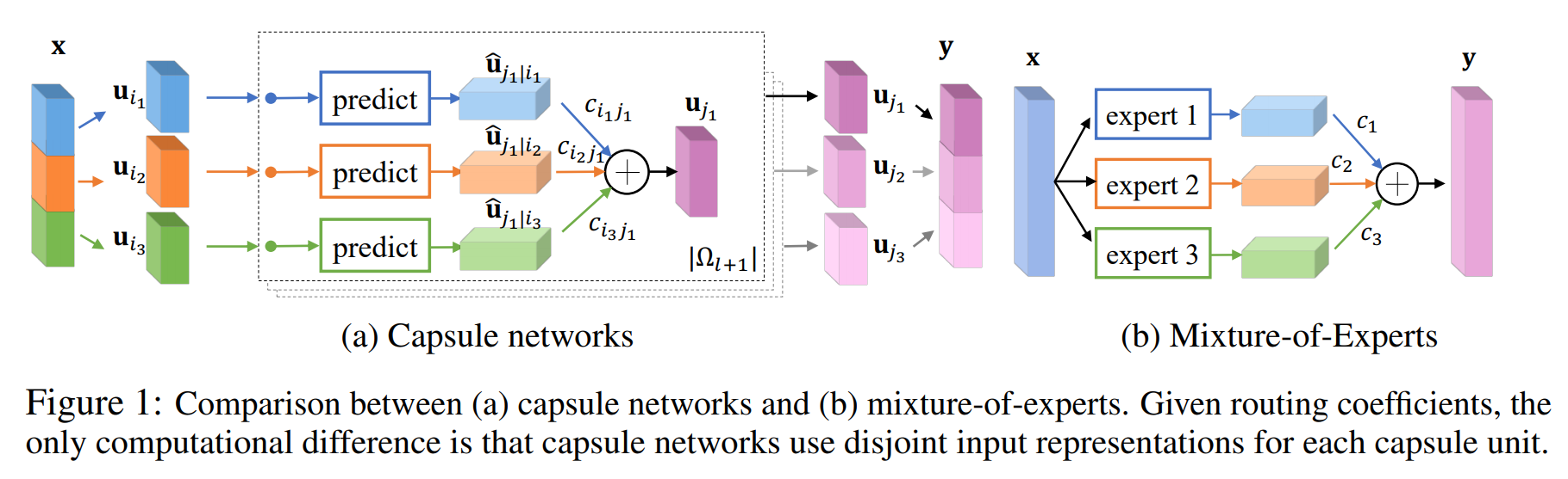이렇게 되면 Capsule Network를 Mixture of Experts(MOE)의 관점에서 해석할 수 있습니다. 각 Capsule이 entity를 검출하는 expert의 역할을 담당합니다. 아래 그림을 보면, Capsule network와 MOE가 submodule들을 앙상블 한다는 점에서 상당히 비슷함을 알 수 있습니다. 다만 Capsule들은 MOE의 Experts와 달리 feature space를 공유하지 않습니다.