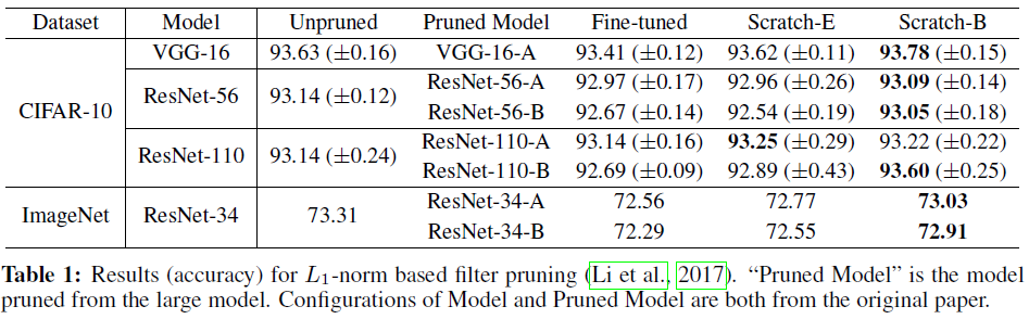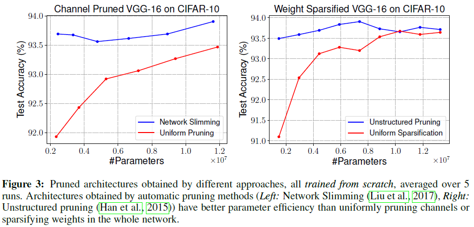 한마디로 말하면, pruning의 의미는 중요한 weight를 얻는 것이 아니라 architecture를 찾는 것에 있기 때문에, 애초에 큰 모델을 학습시키고 그 weight를 보존할 필요가 없고 작은 모델을 random initialization부터 학습시키는 것이 더 낫다는 이야기입니다. 저자들은 여러 실험을 통해 이 가설이 성립함을 보여주었습니다.
