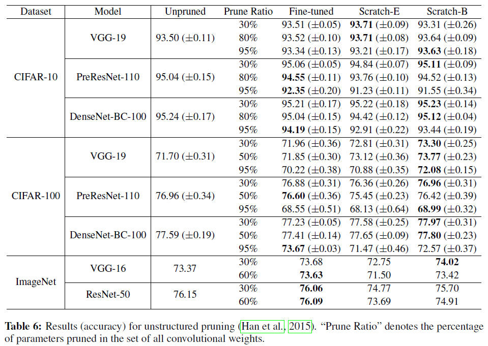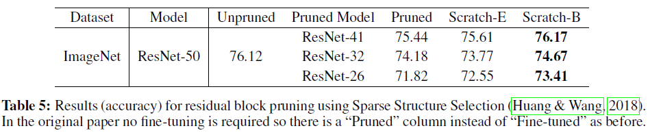위의 실험 결과를 보시면 CIFAR 데이터셋에서 pruning 비율이 클 때(95%)에는 fine-tuning 결과가 scratch 결과보다 더 나을 때가 많다는 것을 알 수 있습니다. 또한 ImageNet과 같은 큰 데이터셋에서는, 대부분의 경우 Scratch-B가 fine-tuned보다 꽤 저조한 성능을 보입니다. 저자들은 이에 대한 이유로 두 가지 가설을 제시했습니다. 1. network가 굉장히 sparse하거나 (CIFAR), 데이터셋이 크고 복잡할 경우 (ImageNet)에는 모델을 처음부터 학습시키는 것이 어렵고, 2. unstructured pruning이 위의 structured pruning과 비교하여 weight의 분포를 더욱 많이 변화시키기 때문입니다.