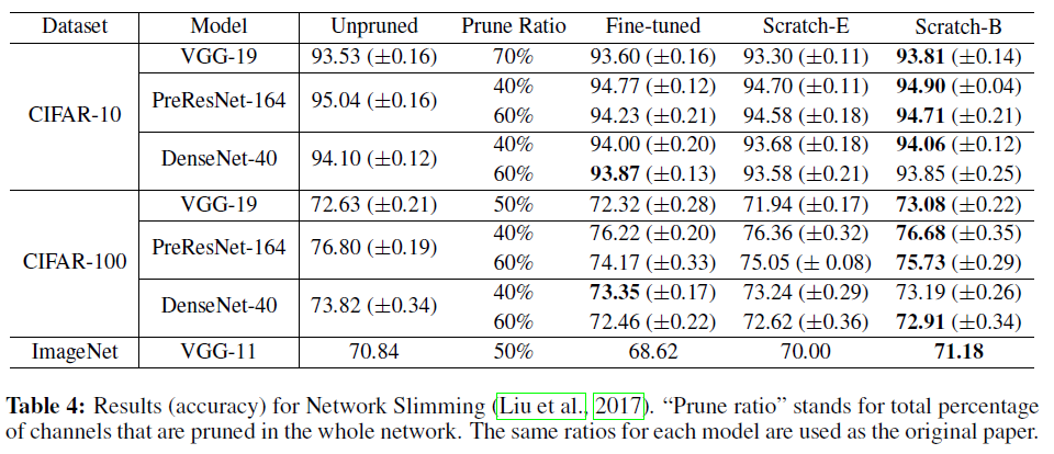 앞서 말씀드린 대로 저자들의 주장은 pruning의 진정한 의미는 효울적인 네트워크의 구조를 찾는 것에 있다는 것입니다. 이를 증명하기 위해 각 layer의 channel을 같은 비율로 잘라낸 모델(uniform pruning)과 성능을 비교했습니다. 특히 channel pruning의 경우 모든 경우에서 network slimming 모델이 uniform pruning 모델보다 좋은 성능을 보였습니다.