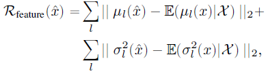 DeepInversion은 실제 training dataset 이미지와 synthesized image를 CNN에 포워딩 시켰을 때 각 레이어의 feature map 거리를 최소화 시켜 원래 이미지의 데이터 분포를 따라가게 하는 term을 추가 했습니다. feature 통계정보로서 feature map에서의 평균과 분산을 활용하였고 이러한 정보는 생성된 이미지가 실제 이미지의 분포를 따를 수 있도록 정규화 합니다. 따라서 synthesized image가 실제 training dataset batch단위의 평균과 분산을 따라가게 하는 R_feature term은 아래와 같습니다.