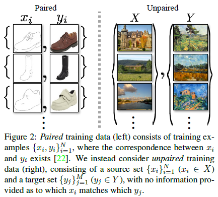 이러한 두가지 도메인에 대해 image-to-image translation을 진행하기 위해서는 training set이 이미지 i에 대해 pair가 되는 X와 Y 도메인 데이터(paired data)가 존재해야 합니다. CycleGAN이전에 연구되었던 Pix2Pix 모델에서는 반드시 두 도메인 양쪽에 대응되는 paried data가 존재해야 했지만 CycleGAN에서는 paired data 없이도 하나의 이미지 도메인을 다른 도메인으로 바꾸는 것이 가능합니다.