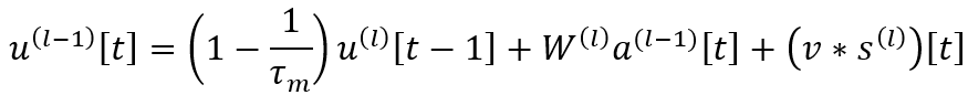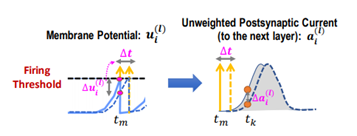 - 즉, presynaptic neuron j에서 postsynaptic neuron i로 PSC가 전달되어 weight에 의해 가중합이 된 것이 postsynaptic neuron의 membrane voltage u_i 가 변화함을 알 수 있습니다. 이렇게 변화한 voltage는 threshold Vth를 넘으면 spike s_i 가 발생하며 뇌에서 일어나는 탈분극, 재분극, 분극 상태처럼 동작하게 됩니다.