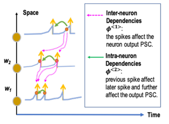 - 하지만, 모든 시간에 대해서 계산한다면 deep SNN에서 time step수만큼의 모든 neural network를 계산해야 하므로 기존 DNN보다 복잡도가 time step수 배만큼 늘어나게 됩니다. 이러한 상황을 억제하기 위해서 논문에서는 2가지의 dependency로 나누어 back propagation method를 제시합니다.