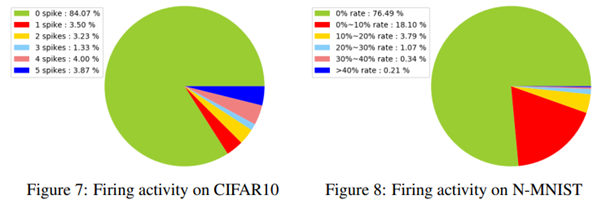 - SNN의 특징인 일부만 Firing을 실행하여 energy efficiency를 달성하는 데에 있어서 얼마나 잘 달성했는지 CIFAR10과 N-MNIST에 대해 비교하였으며, 이를 현재 DNN에서의 pruning을 연구하는 사람들의 관점에서 바라봤을 때, 많은 node를 pruning하여 sparsity를 달성하여 mobile환경에서도 사용시에 어떤 관점으로 바라봐야 할지에 대한 다음의 실험 결과도 확인할 수 있었습니다.