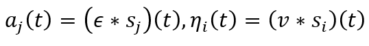 - 또한, postsynaptic current(PSC) a_j(t)에 대해서 incoming spike s_j(t) 는 다음과 같은 1차 미분 관계식을 갖습니다. (Spike response: ϵ , Reset kernel: v )