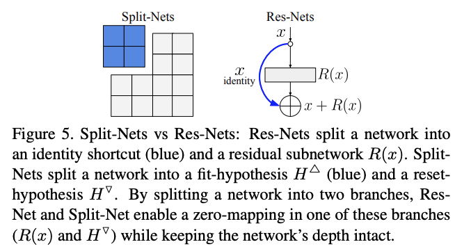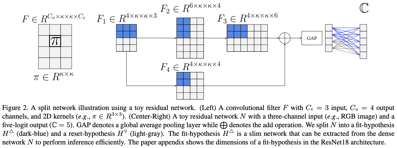 - 먼저 개념적으로 deep network($N$)를 2개의 배타적인 hypothesis(sub-network): fit-hypothesis($H^\triangle$), reset-hypothesis($H^\triangledown$)로 나누는 마스크($M$)를 생성합니다. ($H^\triangle = MN$, $H^\triangledown=(1-M)N$)