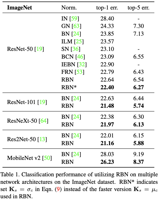 Representation Batch Normalization(RBN)은 기존 BN의 장점인 Batch statistic 정보를 유지하며 적은 추가적인 파라미터를 통해 효과적으로 instance의 statistic을 적용합니다. centering calibration은 feature의 유용한 representation을 강화하고 noise를 감소시킵니다. Scaling calibration은 feature의 강도를 제한함으로써 채널간의 안정적인 feature 분포를 형성하게 합니다. RBN은 BN의 centering/scaling operation을 사용하는 기존의 방식들에도 쉽게 적용 가능하다는 장점 또한 가집니다.