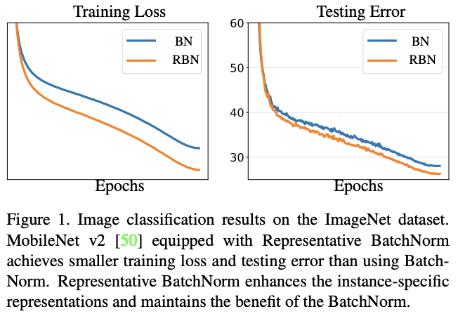 제안하는 Representative Batch Normalization은 feature의 채널별로 3개의 weight를 추가하여 centering, scaling calibration 과정을 수행합니다. 이는 기존의 BN 보다 training loss와 test accuracy를 작게 만들며 기존 BN을 손쉽게 대체 할 수 있습니다.