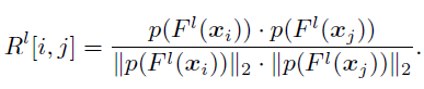 Instance similarity는 intermediate features $F^l(x_i)$간의 similarity로 정의됩니다. intermediate features가 input sample $x_i$의 특징을 잘 대표한다고 할 수 있기 때문입니다. $F^l(x_i)$를 average pooling으로 flatten한다음 cosine similarity를 측정하여 similarity matrix $R^l$을 만듭니다. 이 matrix는 $N \times N$의 shape을 가집니다.