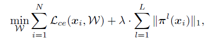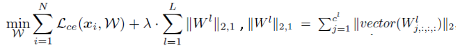 첫 번째 term은 각 sample의 cross entropy loss이고 두 번째 term은 convolution filter간의 channel-sparsity를 만들기 위한 식입니다. $\lambda$값을 증가시킬수록 더 sparse한 network가 생성됩니다.