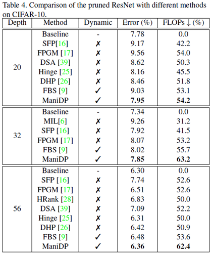 ManiDP-A와 ManiDP-B는 각각 다른 pruning rates를 가지는 모델입니다. ManiDP는 다른 방법론들과 비슷한 수준으로 FLOPs를 줄이면서도 가장 좋은 성능을 보입니다.