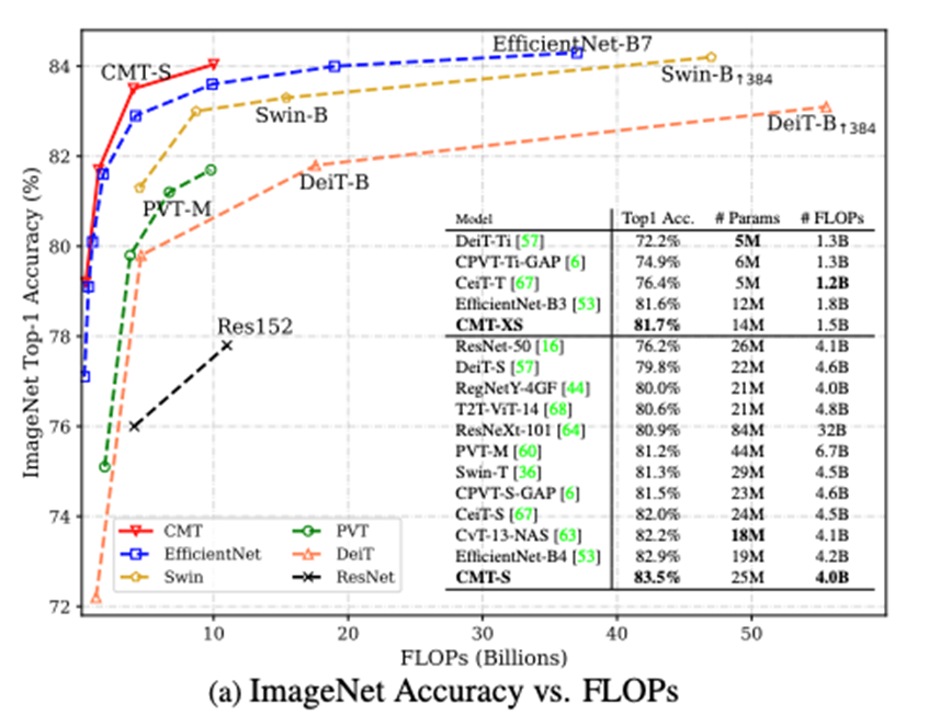 - Vision transformer의 long-range dependency 뿐만 아니라, CNN의 Local Feature의 장점을 활용한 하이브리드 네트워크, 기존의 Vision transformer에서 CNN 모델만큼 높은 성능을 자랑하는 모델인 CMT를 제안한다.