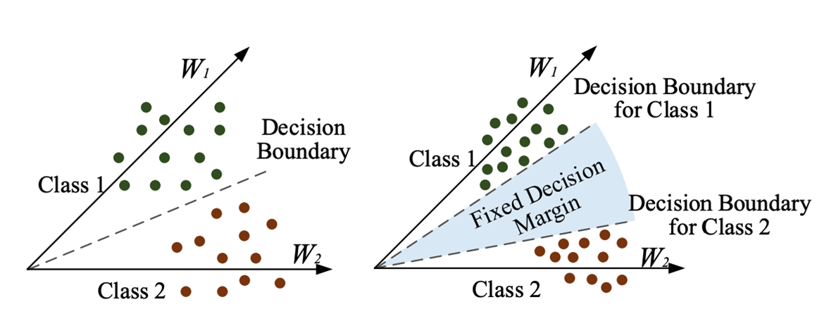 arcface loss는 addictive angular margin loss라고도 불리는데요, 각에 margin term을 추가하여 feature와 class 중심 사이의 각도가 충분히 줄어들도록 학습하게 됩니다.