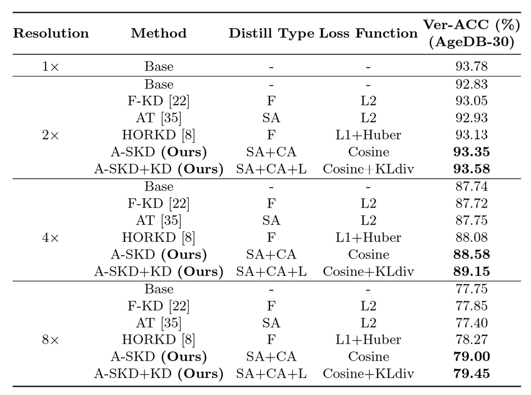 이 논문의 핵심 아이디어는, Attention Similarity Knowledge Distillation (A-SKD)로 Teacher model의 attention map을 student model로 전달하여, 저해상도 이미지에서도 얼굴인식 성능을 내도록 하는것 입니다.