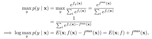 아래에 우리가 알고 있는 softmax값 중 가장 큰 값을 뽑아내는 softmax confidence score로부터 enegy score를 유도해보도록 하겠습니다. (이때 energy score의 T는 1이라고 가정합니다.)