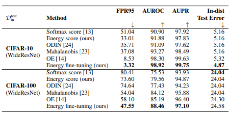 3. Energy score로 fine-tuning 시의 loss 함수로도 사용하여 OOD detection을 할 수 있으며, 성능도 준수하다.