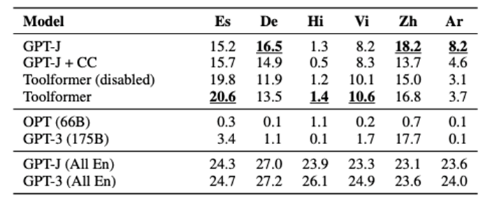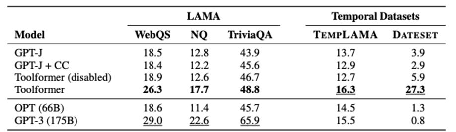 실험 전반적으로 Toolformer 방법론을 통해 학습된 모델이 우수한 성능을 보이고 있으며, 더욱 자세한 실험 결과와 분석에 대한 내용은 논문을 참고해주시면 감사하겠습니다.