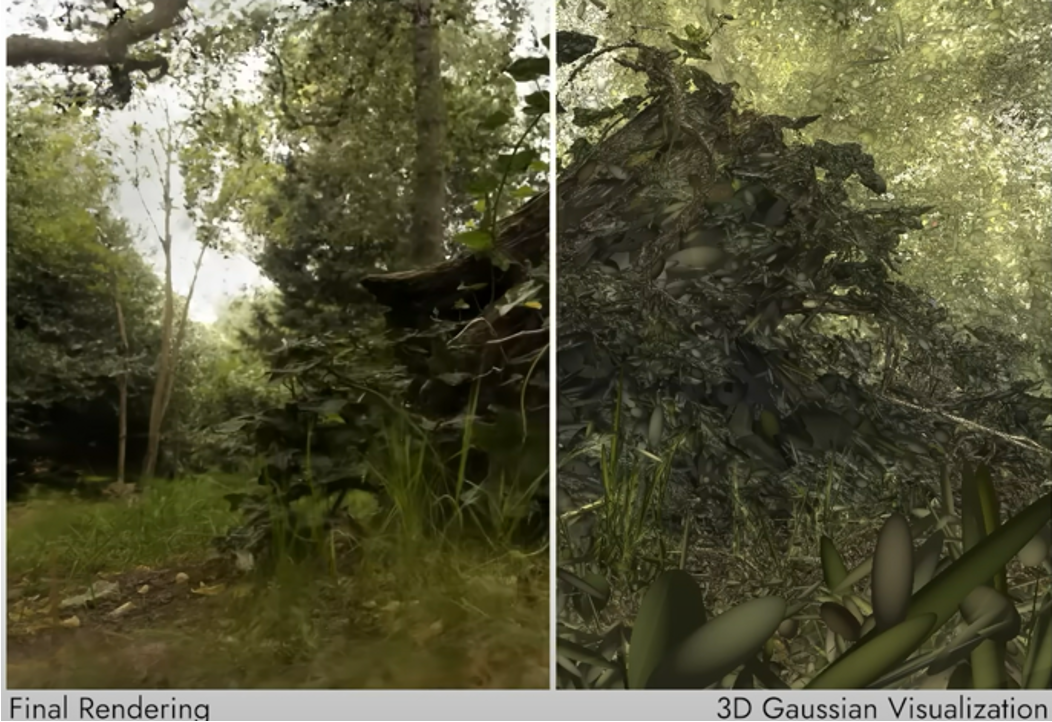 3D Gaussian도 이와 유사하게, 한 차원만 추가해주면 됩니다. 이는 구 형태로 생겼는데, 우측 그림의 3D Gaussian Visualization을 자세히 보면, 숲이 여러개의 초록색 구 형태가 합쳐져서 구성되어 있음을 알 수 있습니다.