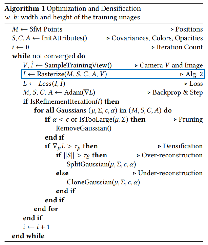 loss를 계산한 뒤 rasterizer가 미분 가능하기 때문에 역전파를 통해 gaussian들의 각 파라미터(M,S,C,A)를 업데이트 해줍니다.