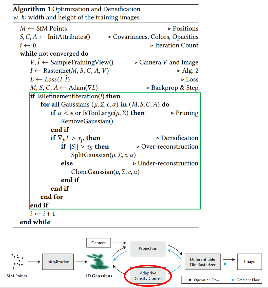 이때 Adaptive Density Control이란 알고리즘이 작용하는데, Gaussian의 크기가 너무 크거나 작으면 이를 복제 / 분할 하여 표현하고자 하는 representation을 잘 담을 수 있게 만들어주는 것입니다.