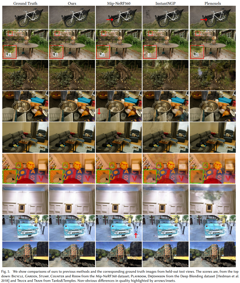 실험 결과는 정말 놀라운데, 이전에 가장 속도가 빨랐던 InstructNGP는 물론, SOTA 모델이였던 Mip-NeRF 360 보다도 훨씬 좋은 3D reconstruction 성능을 보여주고 있습니다. 특히 디테일한 부분도 3DGS는 굉장히 잘 잡는 것을 볼 수 있습니다.