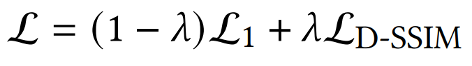 이렇게 구한 이미지 I와 우리가 원래 알고있던 ground truth I hat을 이용해 loss를 계산해줍니다. 이때, loss function으로는 L1 loss와 SSIM loss를 함께 사용합니다.