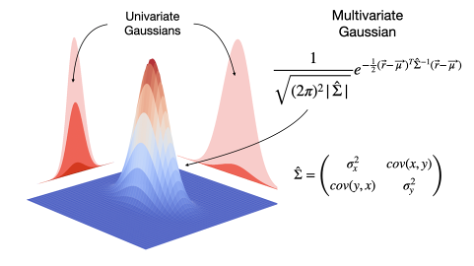 아래 그림은 고등학교때 배운 정규분포(1D Gaussian)와 이를 2차원으로 표현한 2D Gaussian의 형태입니다.
