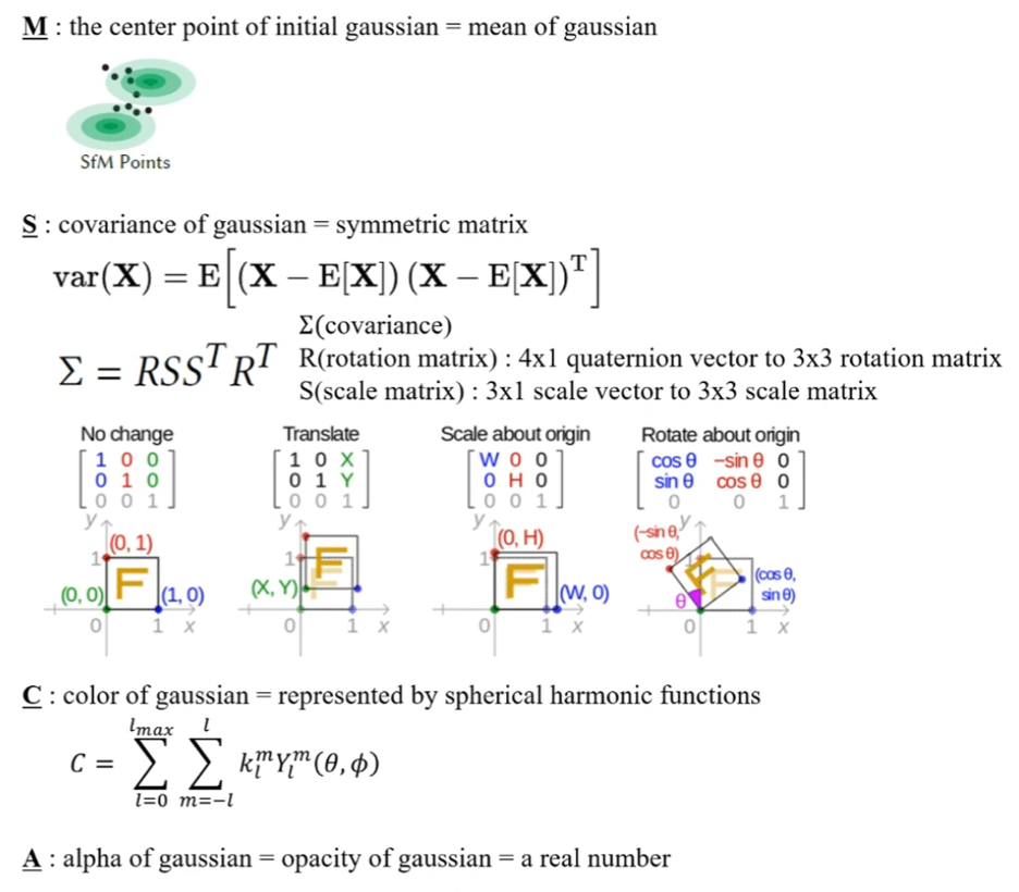 조금 더 구체적으로는 이를 Gaussian의 평균값(M)으로 초기화하는데, 이 외에도 S(covariance), C(color), A(opacity) 등을 초기화해줍니다.
