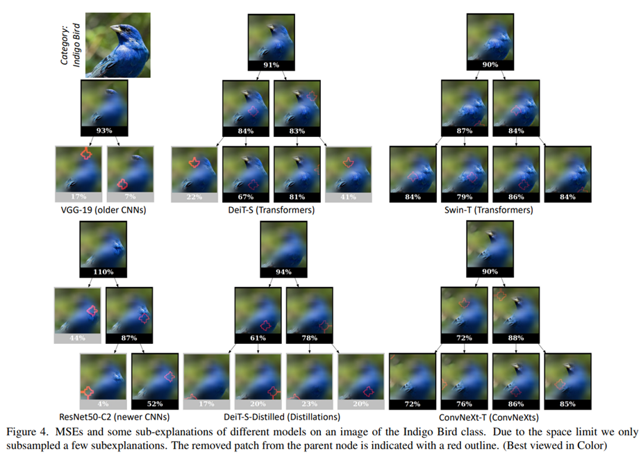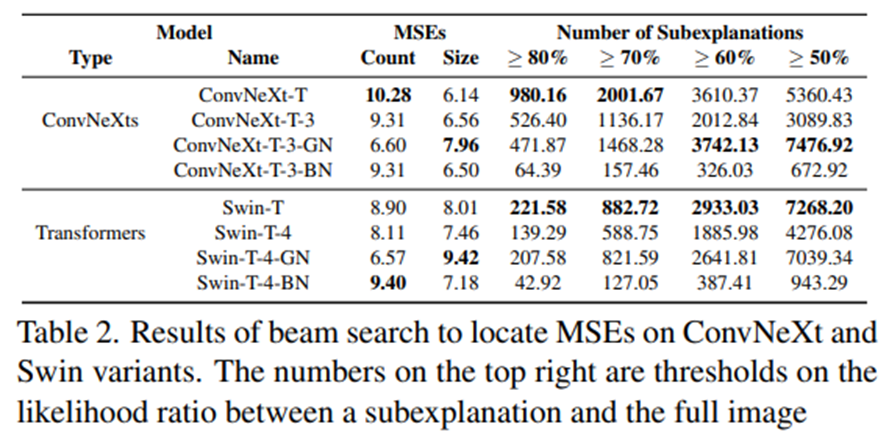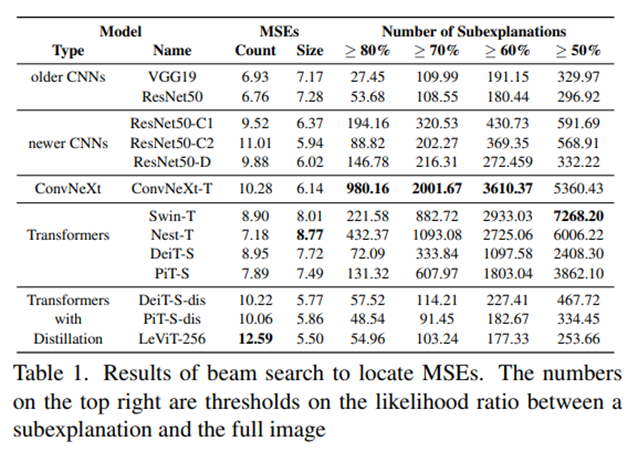 실험 파트를 통해 ConvNeXt 모델과 Trasnformer 모델이 다른 CNN들과 Distillated Transformer에 비해 높은 subexplanation의 수를 보입니다. 즉, 높은 subexplanation이라는 뜻은 네트워크가 여러 서로 다른 패치 집합을 통해 자신 있는 분류를 형성할 수 있음을 의미합니다(Compositionality가 강함).