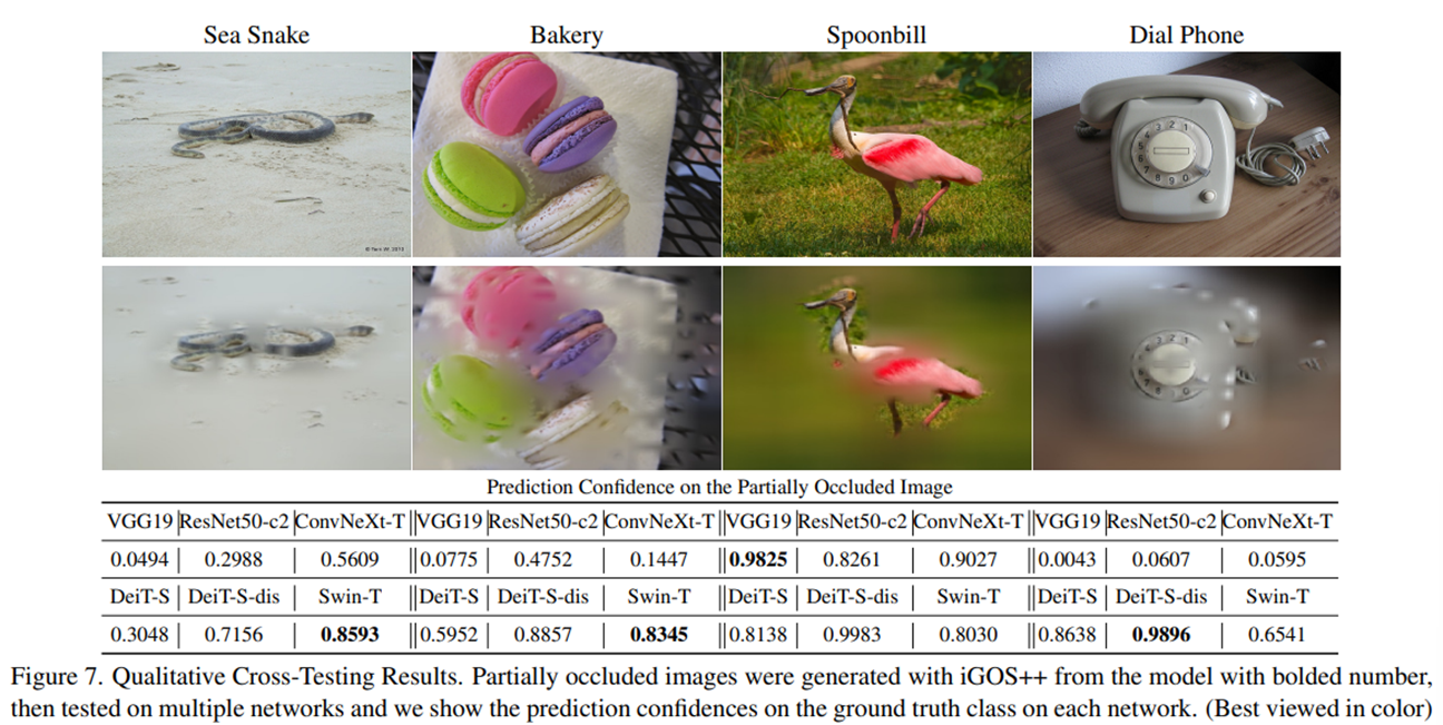 위 실험 결과에서 가장 두드러지게 보이는 점은 세 번째 열의 Spoonbill 이미지에서 VGG에 의해 생성된 경우, 대부분의 다른 네트워크도 자신 있는 분류를 얻을 수 있었습니다. 그러나 VGG는 다른 네트워크가 생성한 가려진 이미지에서 매우 낮은 성능을 보였으며, 이는 특정 특징에 과도하게 의존하여 이러한 마스크 아래에서 그 특징이 존재하지 않을 수 있음을 보여줍니다. (Bold 글씨체가 생성된 모델을 뜻합니다.)